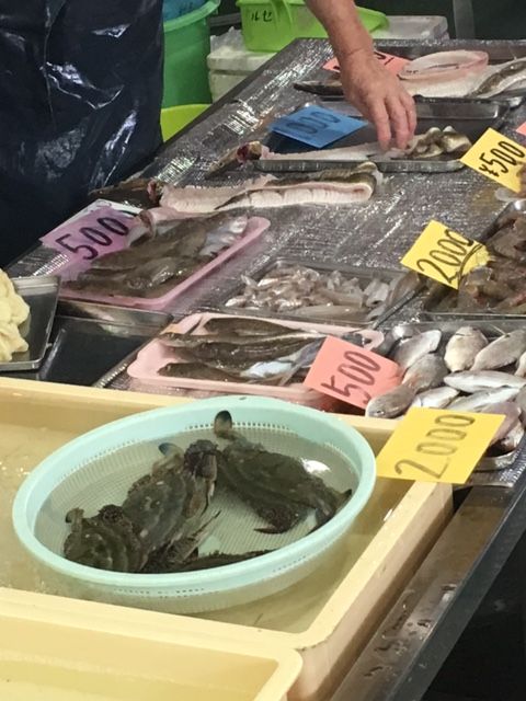 ・水槽で泳いでいる体長50cmほどのクロダイ2匹で1800円。その場で3枚下ろしにしてもらって、巻貝一袋をおまけにいただきました。