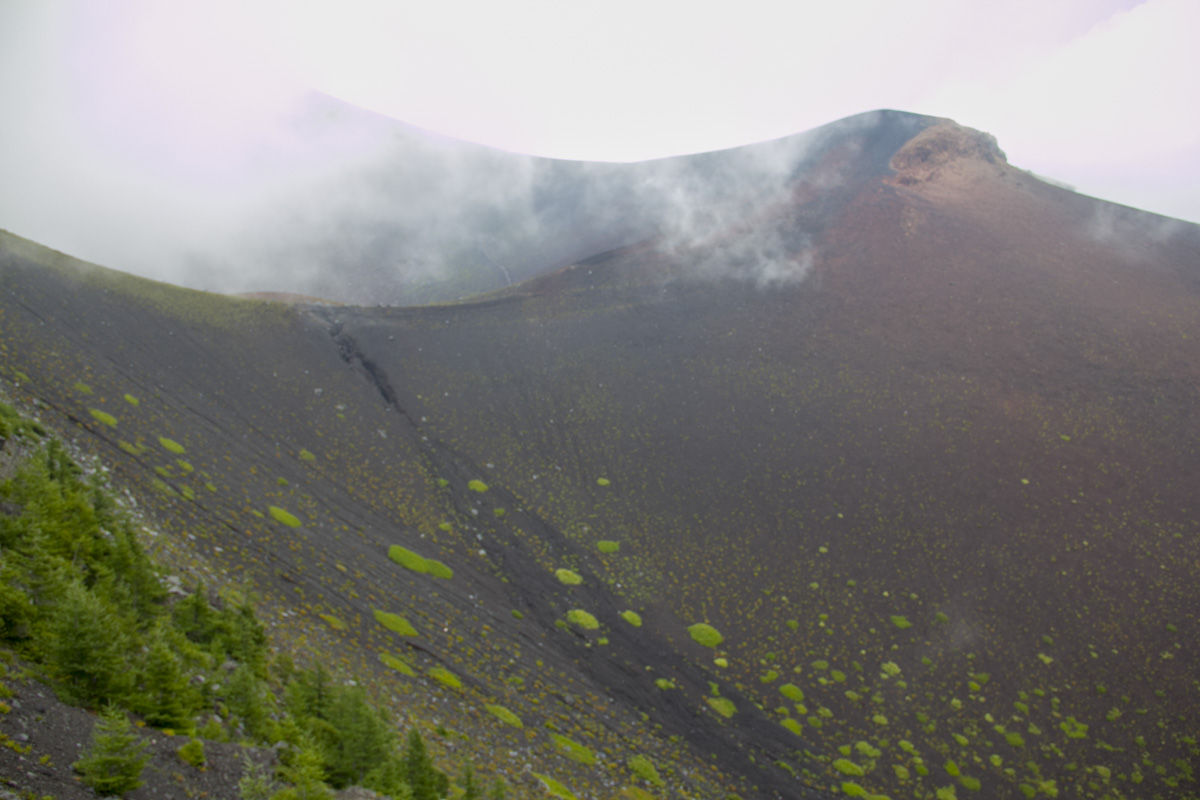 お天気は曇りというか霧模様で肌寒かったが、第二火口縁に着いた頃、少し晴れて火口や宝永山の頂が見えた。また、急坂を登って第一火口縁に着いた時はまた霧が深くなったが、火口底に降りたあたりでほんの少しの間、スーッと霧が晴れ、火口だけでなく富士山の稜線も眺望でき、皆々感動!